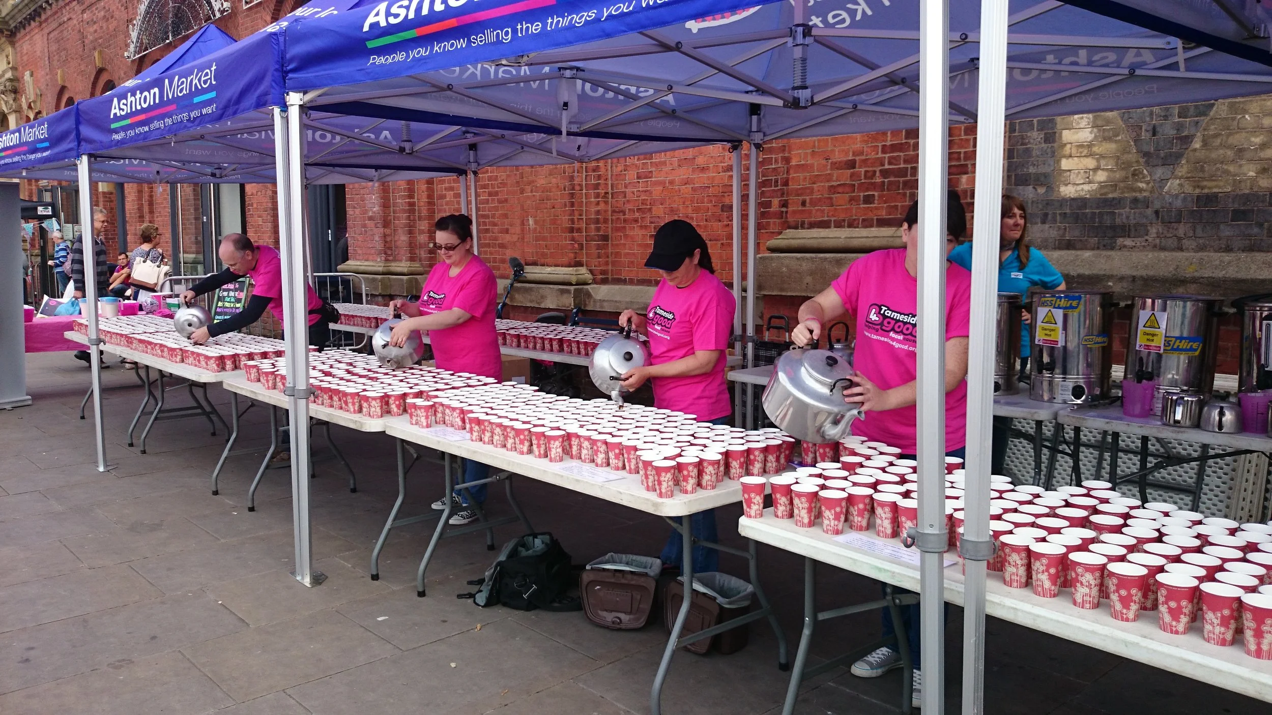 Saturday was a beautiful day and Ashton market looked wonderful. There were ladies in Victorian costumes, stilt walkers, a Punch and Judy show, deck chairs and even a beach. I had seen some sand dumped in the market square off the back of a lorry and I was a little confused at the time. Today it looked transformed. There were even two men in leotards who may have been acrobats. One walked around on the other’s shoulders so I will assume that. When I arrived all the cups were laid out and the urns boiling until disaster struck and the generator broke. It was a shame because I could really have done with a brew. Finally it was fixed and the challenge began. It wasn’t the most exciting start as the teams had to wait for the tea to brew but they were off. I spent an hour running up and down the tables. Measuring tea and checking that the rules were followed. I felt awful telling the teams that they had missed something or not filled the tea high enough. We needed every cup to count for the current record to be broken. The worst thing was feeling extremely thirsty throughout; tea, tea, everywhere and not a drop to drink. Once the tea was checked and noted down the public could give a donation for a cup of potentially record breaking tea. The green tea did not do well at all.